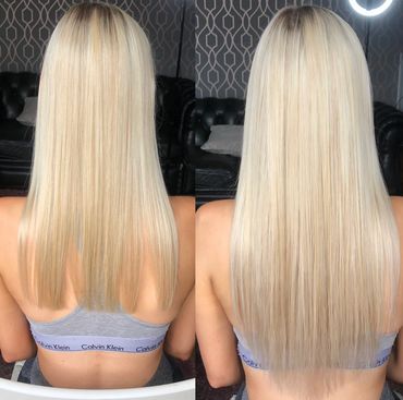 From noticeable damage caused from a different hair extension method to healthier, stronger hair with more even ends & all over thickness!